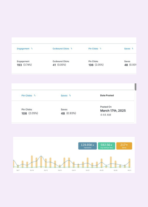 Social Media Management for Client R. Includes social media strategy, content creation, caption, scheduling, and analytics reporting, and the channels were Pinterest, Instagram, and LinkedIn. This was a total hands-off project. The client only has to review and approve.